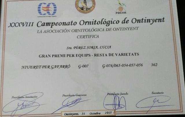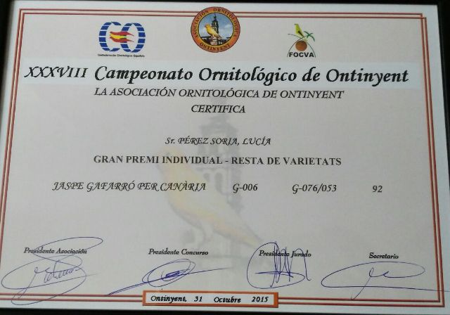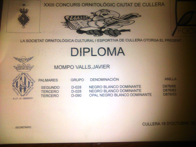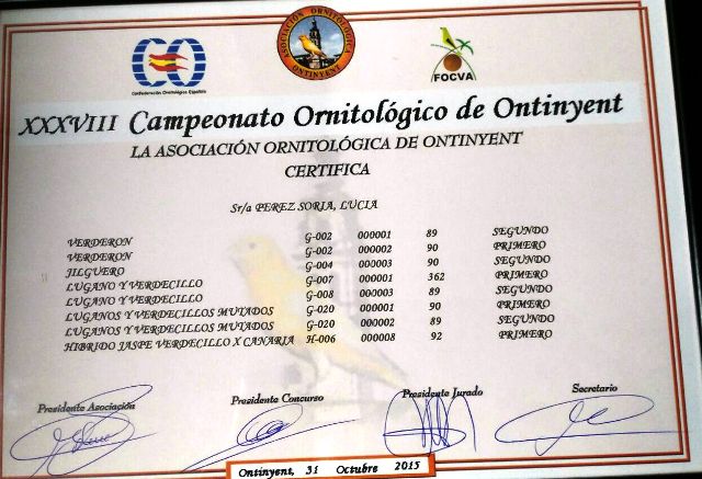 este año en el 2011 solo hemos presentado pajaros en Onteniente concurso dificil por la gran calidad y cantidad que se presntan en dicha sociedad obteniendo un oro un plata y un bronce el bronce en equipo agata amarillo mosaico oro y plata en verderon clasico ya hiremos poniendo resultados los proximos años